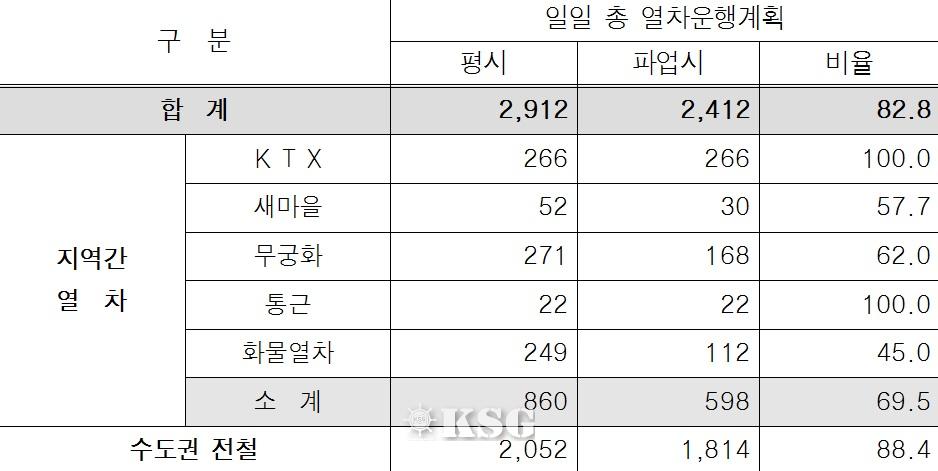 KTX와 통근열차 운행률은 100%로 나타났다. 새마을호와 무궁화호는 각각 57.7% 62%의 수준을 보였다.
