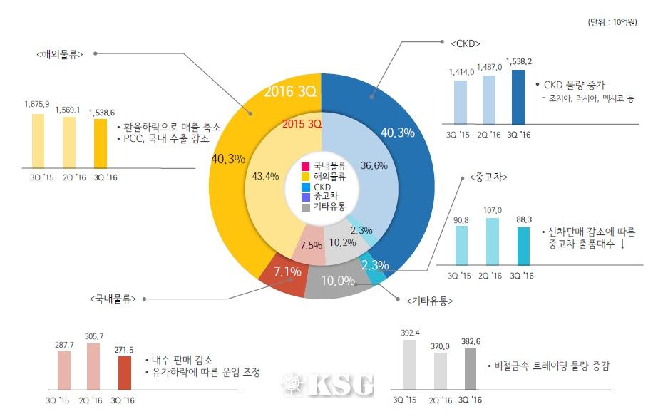 한편 현대·기아차의 1~9월 수출량은 전년 대비 18% 감소한 142만2000대에 그쳤다. 7~9월은 파업 영향으로 21% 급감한 39만7000대로 떨어졌다. 9월 말 기준 자동차 선대는 55척으로 자사선이 29척, 정기용선 선박이 26척, 신조 발주잔량은 4척으로 알려졌다. 현대글로비스는 PCC(완성차운반전용선)선 4척을 2017년에 인도받을 예정이다. 운항 규모는 6월 말에 비해 1척 증가했지만 2014년 말 대비 4척 적다.