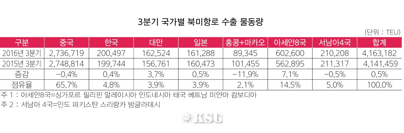 같은 기간 중국발 수출물량은 273만6719TEU로 전년동기대비 0.4% 감소했다. 중국의 북미수출 물량 점유율은 65.7%에 달하고 있다. 일본발 물동량은 전년대비 0.5% 증가한 16만1288TEU를 기록했다. 대만발 수출물량은 16만2524TEU를 기록해 3.7% 증가했다. 대만은 9월 실적은 뒷걸음질 쳤지만 분기실적은 늘었다.