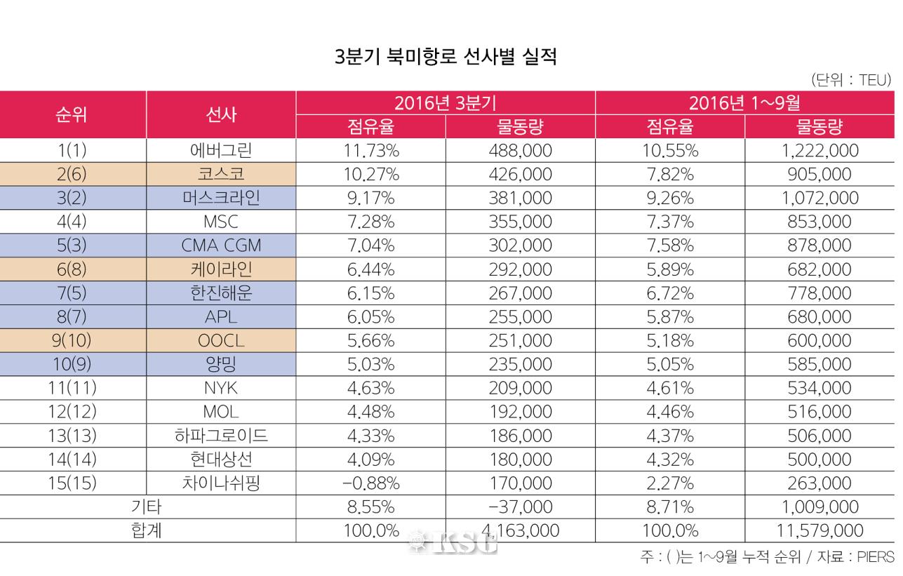 3분기에 15곳의 선사 중 머스크라인, CMA CGM, 한진해운, APL, 양밍을 제외한 선사들은 모두 기존 순위를 유지하거나 순위가 올랐다.