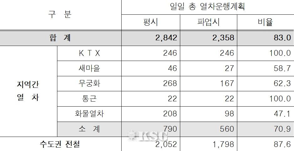 KTX와 통근열차 운행률은 100%로 나타났다. 새마을호와 무궁화호는 각각 58.7% 62.3%의 수준을 보였다.