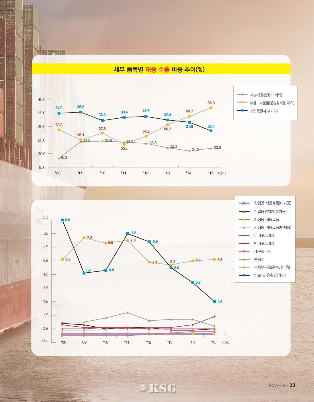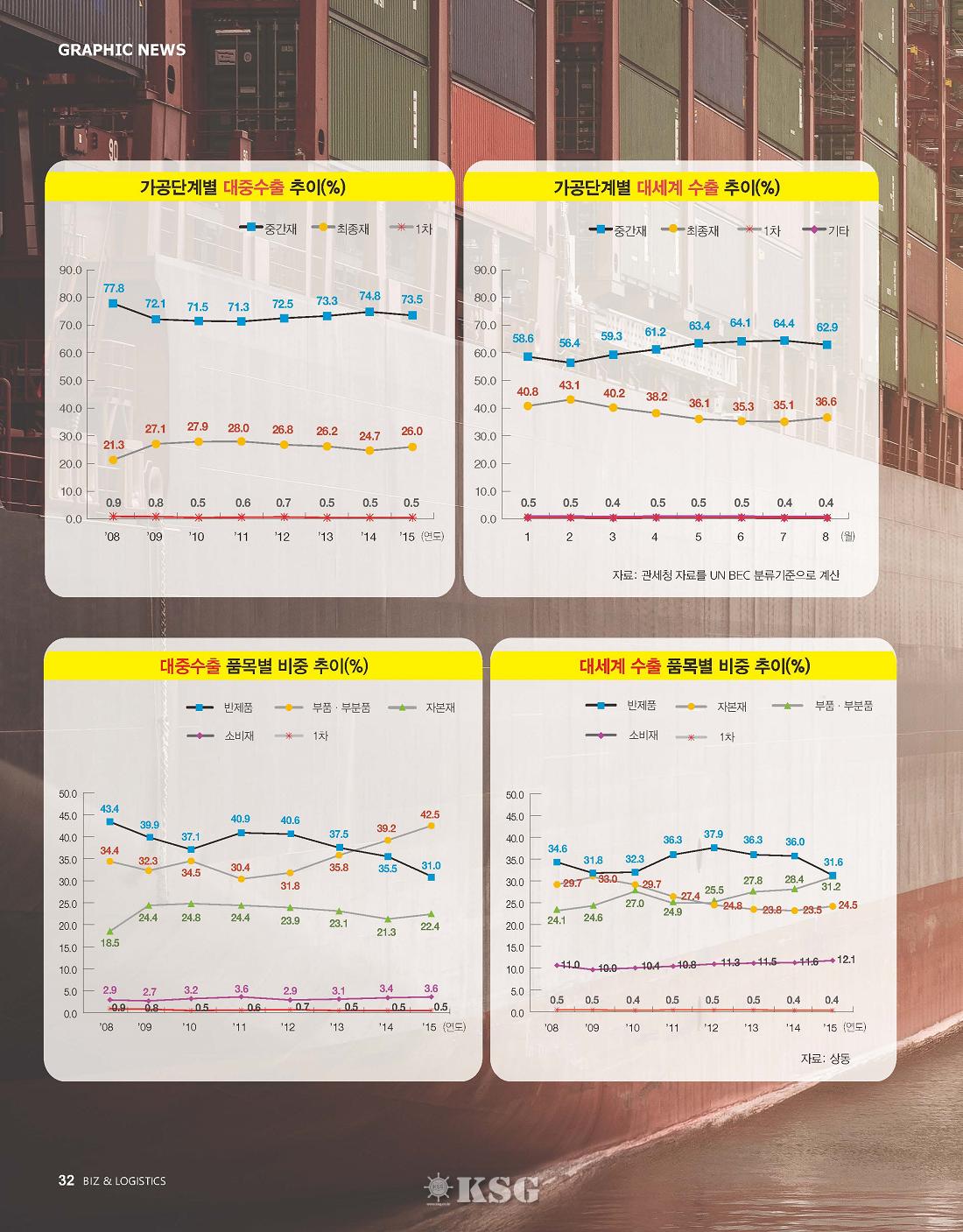 최종재의 비중은 26.0%로 전년도에 비해 1.3%포인트 늘어났으나 전체 수출에 대한 비중(36.6%)에 비해 10.6%포인트 낮은 수준에 머물렀다. 2015년 한 해 대중수출 증가율은 5.6%, 최종재의 수출 증가율은 0.8%를 기록했다.