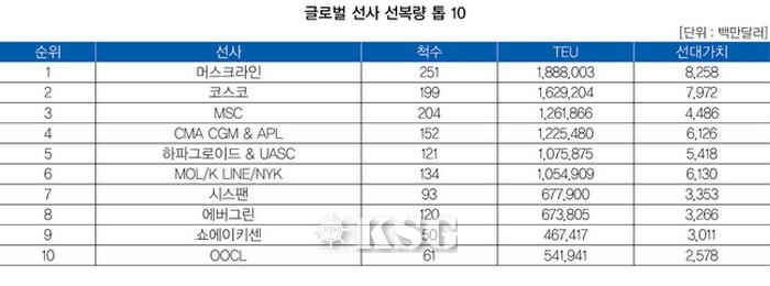 MSC는 선복량 204척 126만1866TEU를 기록하며 3위에 올랐지만 선가는 44억8600만달러를 기록해 선대가치는 6위에 머물렀다. 9위에는 일본선사인 쇼에이키센이 이름을 올렸다. 쇼에이키센은 선복량 46만7417TEU로 선가는 30억1100만달러를 기록했다.
