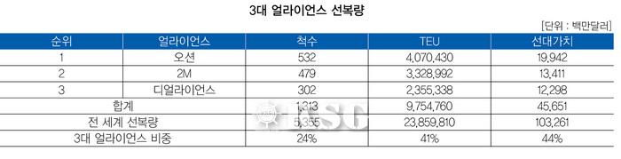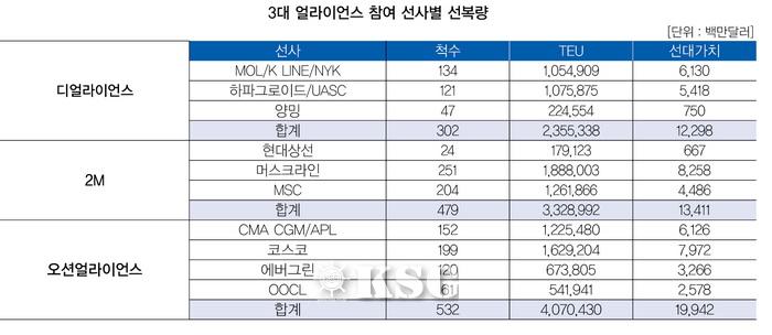 2M, 오션, 디얼라이언스가 전 세계 선복량 2385만9810TEU에서 차지하는 비중은 41%로 975만4760TEU에 달한다. 선박 척수는 1313척으로 전체에서 24%를 차지하지만 선대가치는 456억5100만달러로 44%를 차지해 이들 얼라이언스가 전 세계 선대가치에 큰 영향을 미치고 있는 것으로 나타났다.