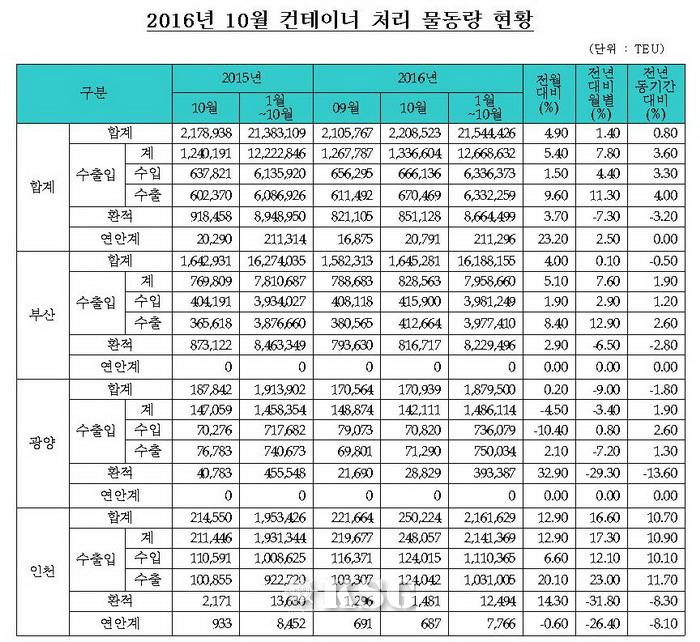 10월 전국 항만에서 처리한 컨테이너 물동량이 한진해운 여파에도 불구 소폭 증가한 것으로 나타났다. 해양수산부는 10월 전국 항만 물동량이 전년 동월 210만5000TEU(20피트 컨테이너) 대비 1.4% 증가한 220만8000TEU를 기록했다고 전했다. 환적화물은 전년 동월 대비 7.3% 감소해 85만1000TEU를 처리하는 데 그쳤지만, 수출입화물이 7.8% 증가한 133만6000TEU를 처리해 전체 물동량은 예년 수준을 유지할 수 있었다.