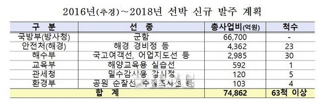 국방부(방사청), 안전처(해경), 해수부, 교육부, 관세청, 환경처에서 군함과 해경 경비정, 어업지도선 등의 선박 발주를 추진한다. 추경에 반영된 총사업비 8000억원 규모의 58척 선박 발주는 이미 완료됐다. 정부는 앞서 11조2000억원을 투입, 2020년까지 250척 이상의 선박 발주를 추진하는 '조선업 경쟁력 강화방안'을 발표한 바 있다.