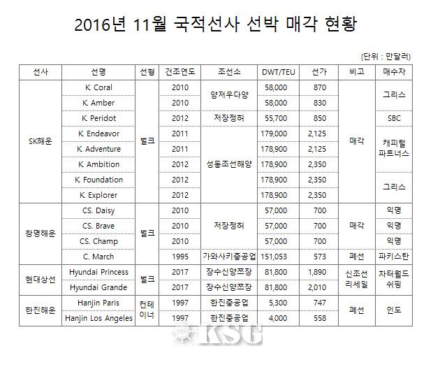 30일 해운업계에 따르면 SK해운을 비롯해 창명해운과 현대상선 한진해운 등이 11월 한 달 간 잇따라 선박을 처분했다. 한진해운과 창명해운이 법정관리에 따른 채권단 측의 채권 추심이 선박 매각의 이유라면 SK해운과 현대상선은 선대 감축 또는 자산 유동화가 배경이다.