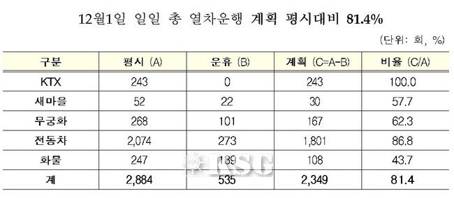 국토교통부에 따르면 철도파업 10주차인 12월1일(06시 기준) 화물열차는 247대에서 139대로 줄어 43.7% 수준으로 운행된다. 전체 열차 운행률은 평시의 81.4%로 KTX는 정상운행 중이나, 수도권 전철, 새마을·무궁화, 화물열차는 일부 감축 운행된다.