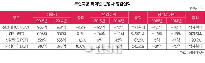 감만부두는 지난해 104억원의 영업손실, 116억원의 당기순손실을 기록해 감사를 맡았던 부경회계법인에서도 계속기업으로서의 유지에 의문을 제기했다. 신선대부두도 128억원의 영업손실을 기록해 2014년 72억원 대비 손실 폭이 눈덩이처럼 불어났다. 반면 신감만부두의 영업이익은 전년대비 크게 줄었지만 6억원 흑자를 거뒀고, 자성대부두(HBCT)는 1년 전 12억원 대비 4배 이상 증가한 52억원을 기록했다.