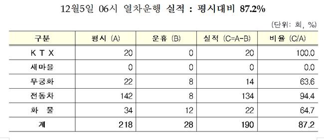이날 KTX는 정상운행되고 있지만 수도권 전철과 새마을·무궁화, 화물열차는 일부 감축 운행돼 평시 대비 운행률은 87.2%에 그치고 있다.
