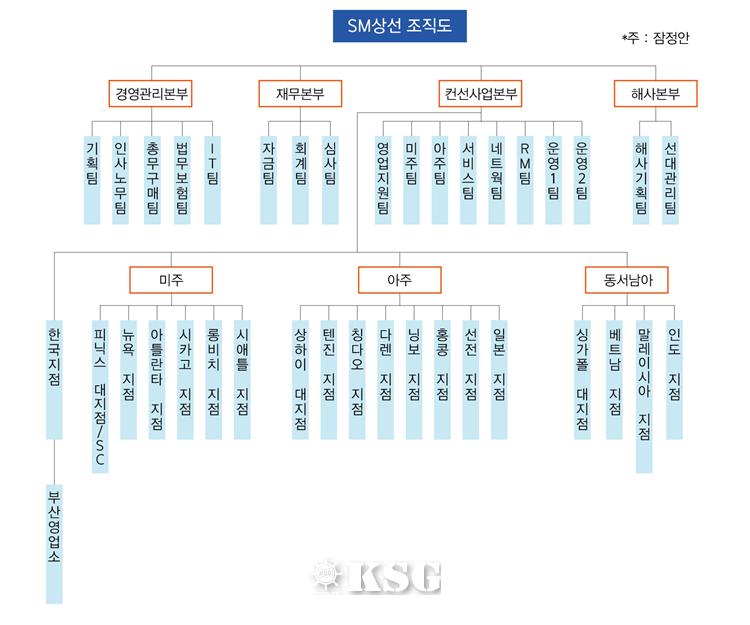 인수일이 가까워오면서 인수 이후 SM그룹에서 벌이게 될 컨테이너선 서비스에 대한 대강의 윤곽이 그려지고 있다. 22일 해운업계 및 법원에 따르면 회사명은 국문 에스엠상선, 영문 SM Line Corporation으로 확정됐다. 회사 조직은 4본부 18개팀으로 구성된다. 경영관리본부 재무본부 컨테이너선사업본부 해사본부가 경영을 진두지휘하게 된다.