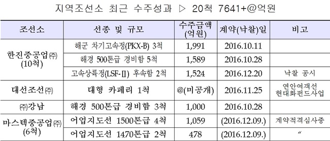 부산 지역에서 가장 높은 성과를 낸 한진중공업은 5100억원의 규모의 일감을 따냈다. 한진중공업은 지난 10월 해군 차기고속정(PKX-B) 3척, 해경 500t급 경비함 5척 수주에 이어 12월 1524억원 규모의 고속상륙정고속상륙정(LSF-Ⅱ) 후속함 건조사업을 낙찰 받았다.