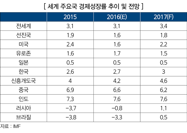 세계경제는 주요국을 중심으로 성장세가 둔화되고 있는 가운데, 2017년에는 성장세가 완만하게 개선될 것으로 전망되고 있다. 2016년 세계경제는 글로벌 투자를 중심으로 경기부진이 지속되고 교역량 증가세도 둔화되면서, 미국, 중국 및 유로존을 중심으로 성장률이 하락했다. 국제통화기금(IMF)은 2017년 세계경제가 미국과 자원수출국을 중심으로 성장세가 확대되면서 부진이 점차 완화 될 것으로 전망하고 있다.