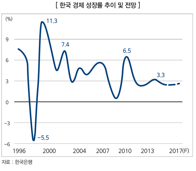 2017년 한국경제의 모습은 밝지만은 않다. 긍정적 요인을 찾기가 힘들다. 경제성장률은 2014년 3.3%, 2015년 2.6%로 둔화되었고, 2016년에는 2.5%로 더 하락할 것으로 보인다. 2017년 경제성장률은 2%대 중반에 그칠 것으로 전망된다. 신흥국을 중심으로 세계 경기가 완만하게 회복되면서 수출이 마이너스에서 벗어날 것으로 보이지만, 고용 여건 악화, 소비 침체 및 투자 위축 등으로 내수 경기가 지속적으로 악화될 것으로 전망된다. 최근 경제협력개발기구(OECD)도 2017년 한국경제 성장률을 3.0%에서 2.6%로 0.4%p 하향조정했고, KDI, 한국경제연구원 등의 주요기관들도 하향조정 하고 있다.