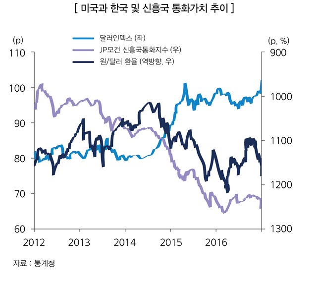첫째, 미국 기준금리 인상 속도에 주목해야 한다. 2016년 12월 미국은 기준금리를 0.25%p 인상했고, 2017년에는 경제회복 여건 등을 고려하여 3차례 인상할 계획을 발표했다. 반면 한국의 경우 경기 부진이 장기화 됨에 따라 기준금리를 인상하기 어려운 여건 하에 있다. 일각에서는 추가적인 기준금리 인하가 필요하다고 보기도 한다. 이렇게 될 경우, 한국과 미국의 금리차가 좁혀지고, 이에 따라 외국인 투자자금이 빠져나갈 우려가 있다. 더욱 큰 우려는 신흥국으로 투자 되었던 외국인 자금이 급격히 빠져나갈 가능성이 높고, 이에 따라 신흥국 외환위기로 확대될 위협이 있다는 점이다. 한국은 중국과 동남아시아국가연합(ASEAN)에만 총 수출의 40% 이상을 의존하고 있기 때문에 위기 시 수출에 큰 충격을 줄 수 있다. 경기부진에서 벗어나기 위하여 신흥국들은 기준금리를 추가적으로 인하해야 하는 상황에 직면하였으나, 자금유출을 우려하여 추가적인 기준금리 인하도 어려운 상황에 처할 수 있다. 신흥국 경제가 위축되면, 한국의 수출경기에 문제가 초래될 수 있다. 따라서 미국 기준금리 인상 속도와 신흥국의 자금유출 속도는 2017년에 주목해야할 중대한 현안이 될 수 있다.