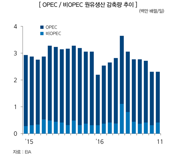 셋째, 석유수출국기구(OPEC)의 석유 감산 합의 경과는 세계 경제의 중요한 변수가 될 것으로 보인다. 2016년까지 세계경제가 불황을 겪으면서, 원유 수요가 크게 주는 반면, 공급량이 크게 유지되면서 공급과잉 현상이 지속되어 왔다. 원유의 공급과잉 현상으로 국제유가가 하락하였다가 최근 OPEC 회원국들의 감산 협의로 국제 유가가 다소 반등했다. 그러나 OPEC 회원국들이 감산 합의 이행을 하지 않을 경우 2017년에도 저유가 기조가 지속될 수 있다. 러시아를 비롯한 비OPEC 산유국들의 감산 합의가 불투명한 상황 속에서 그 합의 경과를 주목해 볼 필요가 있다. 더욱이 트럼프의 화석연료 산업 육성책으로 원유공급량이 확대될 것으로 진단 되는 바 국제 유가의 향방이 어떻게 움직일 것인지에 대한 판단이 매우 모호한 상황이다.