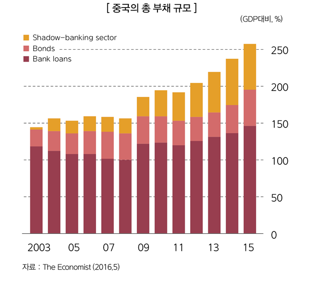 넷째는 중국의 그림자금융(Shadow Banking)이다. 그림자금융이란 정부의 통제를 넘어 고위험 채권에 투자해 고수익을 얻는 유사 금융을 가리키는 말로, 규제의 사각지대에 놓여있다는 특징이 있다. 중국이 고속성장을 하는 동안 그림자금융을 통한 대출규모가 중국 GDP의 82%에 이르렀다. 부채에 의존에 적극적으로 투자했던 기업들은 현재 가동률이 급격히 떨어지고, 부채 상환부담에 위험이 높아지고 있다. 이에 중국경제에는 금융리스크 우려가 확대되고, 중국판 서브프라임 사태의 위험성이 존재한다. 중국 정부가 이러한 리스크를 해소하지 못할 경우 버블이 터지면서 글로벌 경제에 심각한 충격이 가해질 것으로 판단된다. 일각에서는 2017년에 중국발 글로벌 금융위기가 발생할 것이라고 주장하는 만큼 그 중요성은 매우 크다.