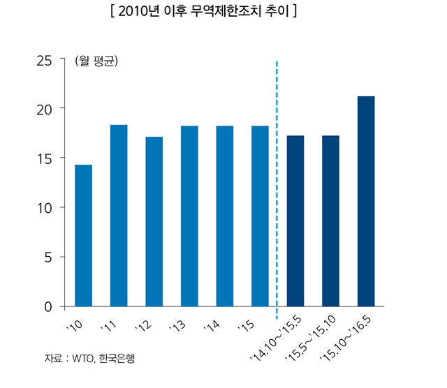 다섯째, 글로벌 보호무역주의 확산과 대응이다. 글로벌 교역에서 자유무역흐름이 약화되고 보호무역추세가 최근 들어 지속적으로 확대되고 있다. 무역제한조치 건수는 점차 증가해 글로벌 금융위기 이후 최고 수준을 기록했다. 보호무역주의는 세계경제의 위험요인으로 작용한다. 각국의 보호무역조치는 상대국의 또 다른 보호무역조치를 낳는다. 그 결과 국가 간의 무역이 감소하고, 세계적인 분업체계가 붕괴되면서 자국 산업마저 붕괴되는 것이다. 투자와 생산이 둔화되고 고용여건을 악화시켜 경제 회복을 막기 마련이다. IMF는 최근 세계경제전망을 발표하면서 세계경제의 4대 위험요인 중 하나로 보호무역주의를 꼽았다. 전례도 있다. 1930년에 미국이 제정한 스무트 홀리법은 자국의 산업을 보호하기 위해 역사상 가장 높은 관세를 부과하도록 했으나, 무역 상대국들은 연쇄적으로 관세를 인상했다. 이는 대공황 악화의 원인이 됐다.