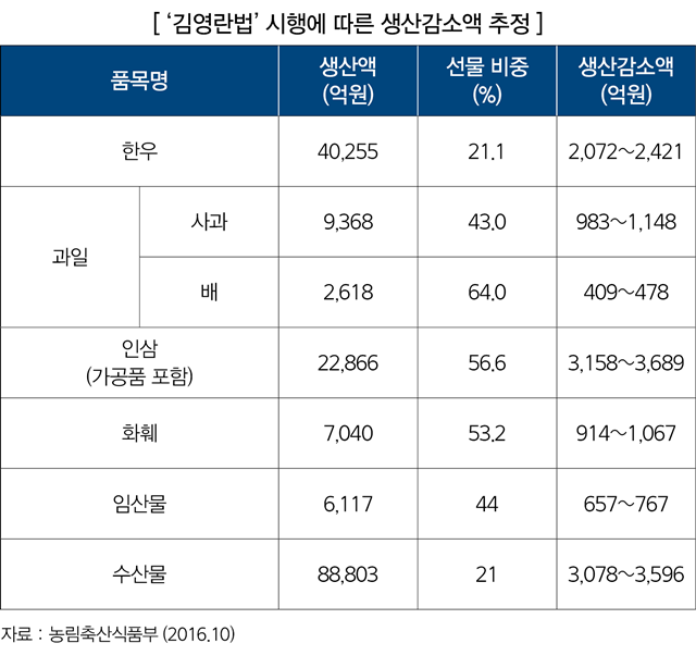 여덟째, ‘김영란법’ 시행의 경제적 파급영향이다. 김영란 전 국민권익위원장의 제안으로 2015년 3월 제정된 「부정청탁 및 금품 등 수수의 금지에 관한 법률」이 2016년 9월 28일 부터 본격 시행되었다. 본래 취지와는 다르게 본 법의 대상에 대해 확대해석하는 경향이 팽배되고, 그러다 보니 국민들은 ‘사람을 만나지 말자’ 혹은 ‘선물을 누구에게도 하지 말자’ 하는 결론에 도출되는 경향이 있어 보인다. 이러한 과정에서 장기적으로는 부패가 해소되는 건전한 경제구조가 형성될 것으로 보이지만, 단기적으로는 서비스업 수요 위축 등 부정적 파급영향이 예상된다. 특히 2017년 1월에 있을 설연휴에는 한우, 인삼, 과일 등의 선물 수요가 위축되면서 내수경기가 위축될 것으로 보인다.