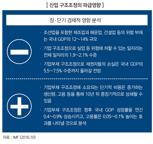 2016년 정책적 노력으로 고용률은 개선되었지만 신규취업자수 축소세가 지속되었다. IMF는 우리나라의 조선·해운업 등 기업부채 구조조정 비용이 31조원에 달하는 것으로 추정했다. 전통적으로 우리 경제를 이끌어 왔던 산업들이 조정되는 과정에서 많은 인력들이 유출되고, 부품 및 원자재 공급업체들이 갈 길을 잃는 등 한국경제가 실의에 빠질 우려가 있다. 공장이 문을 닫으면서 부동산 경기도 위축되고, 많은 밥집들도 폐업으로 연결될 것으로 보인다. 결론적으로 2017년에는 투자위축, 구조조정 등의 영향으로 신규취업자수가 축소되고 실업률이 악화될 전망이다.