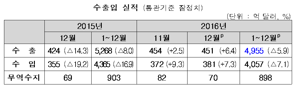 산자부에 따르면 2016년 전체 수출액은 4955억달러로 2015년 4057억달러와 비교해 5.9% 줄었다.