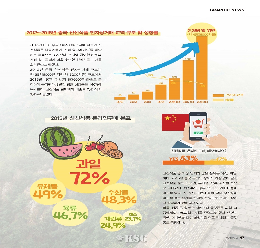 2016년 BCG 중국소비자신뢰조사에 따르면 신선식품은 중국인들이 ‘소비 업그레이드’를 희망하는 품목으로 조사됐다. 조사에 참여한 63%의 소비자가 품질이 더욱 우수한 신석신품 구매를 희망한다고 답했다. 2012년 중국 신선식품 전자상거래 규모는 약 35억6000만 위안(약 6200억원) 규모에서 2015년 497억 위안(약 8조6000억원)으로 급격하게 증가했다. 3년간 평균 성장률은 140%에 육박한다. 신선식품 판매액의 비중도 0.4%에서 3.4%로 늘었다.