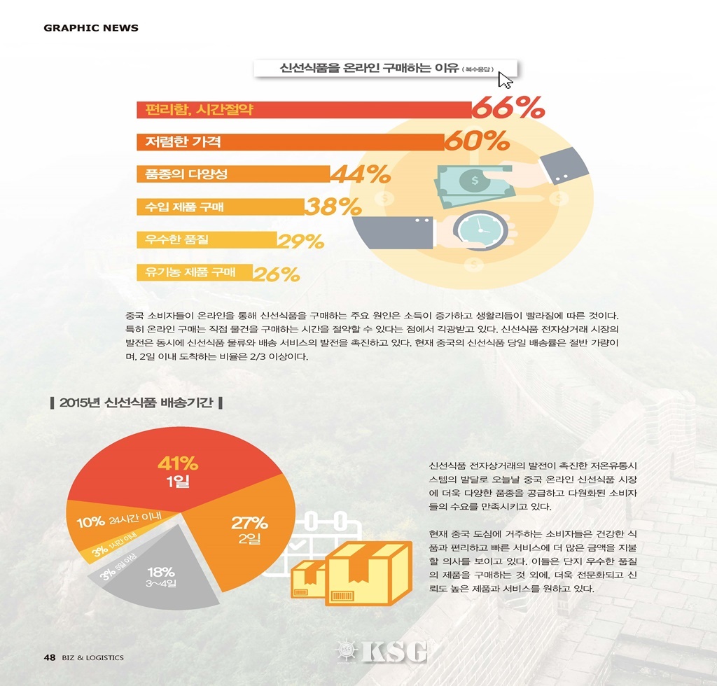 중국 소비자들이 온라인을 통해 신선식품을 구매하는 주요 원인은 소득이 증가하고 생활리듬이 빨라짐에 따른 것이다. 특히 온라인 구매는 직접 물건을 구매하는 시간을 절약할 수 있다는 점에서 각광받고 있다. 신선식품 전자상거래 시장의 발전은 동시에 신선식품 물류와 배송 서비스의 발전을 촉진하고 있다. 현재 중국의 신선식품 당일 배송률은 절반 가량이며, 2일 이내 도착하는 비율은 2/3 이상이다.