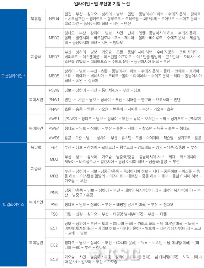 프랑스 CMA CGM, 홍콩 OOCL, 대만 에버그린, 중국 코스코가 참여하는 오션얼라이언스는 동서항로에 350척의 컨테이너선을 투입해 총 41개 서비스를 운영한다. 북유럽에는 6개 노선을, 지중해에 5개 노선을 운영한다. 북유럽항로 NEU4 서비스와 지중해 항로 MED2, MED3, MED5 3개 서비스는 부산항을 기항한다. 북미항로에 아시아와 미서안을 연결하는 PSW9, PNW1, PNW4 서비스와 북미동안을 연결하는 AWE1, AWE4, AWE6 6개 서비스가 부산을 기항한다.