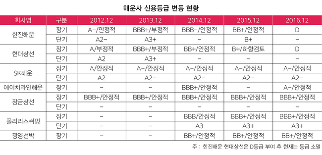 장기운송계약에 기반한 사업안정성과 우수한 현금창출력을 보유한 에이치라인해운의 신용등급이 BBB+(안정적)에서 A-(안정적)으로 상향 조정됐다. 반면 채무불이행 등 신용사건이 발생한 한진해운과 현대상선을 최종 D등급으로 평가됐다.