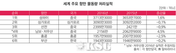 부산항의 세계 5대 항만 입성은 내년을 기약해야 할 것으로 보인다. 부산항은 한진해운 사태 이후 전략적해운제휴그룹(얼라이언스)인 CKYHE얼라이언스가 기항을 사실상 중단하면서, 추가적인 환적 물동량 확보에 실패했다. 상하이항의 세계 1위 질주는 지난해에도 이어졌다. 성장세가 한계에 다다르고 있지만 물동량 처리실적은 7년 연속 세계 1위다. 닝보·저우산항과 선전항은 3위 자리를 두고 격전을 벌이고 있다. 매년 물동량 감소세를 보이고 있는 홍콩항은 12월 막판 뒤집기로 5위 자리를 겨우 유지했다. 세계 5대 컨테이너 항만의 물동량 처리실적은 수요 부진 속에 소폭 늘어나거나 현상 유지에 그쳤다.
