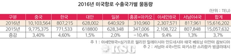 북미수출항로는 2016년 연간물동량도 3년 연속 역대 최고치를 기록하며 2년 연속 1500만TEU 이상을 수송했다. 1~12월 누적물동량은 전년대비 3.7% 증가한 1561만6200TEU를 기록했다. 1~3월 수송량은 전년 동기 대비 7%나 증가하며 호조세로 시작했지만 2, 3분기에는 모두 마이너스 성장을 기록했다. 하반기 이후 다시 수요가 늘어나면서 4분기 9.4% 증가세를 기록, 북미항로는 다시 성장세를 되찾을 수 있었다. 특히 북미항로에서 7%대의 점유율을 갖고 있던 한진해운의 파산으로 선복량이 줄어들자, 운임은 높은 수준에서 유지됐다.