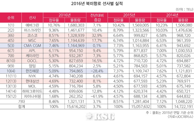 상위권을 유지하던 한진해운은 법정관리 이후 순위가 급속도로 밀리며 10위까지 떨어졌다. 한진해운은 지난해 28.4%나 급감한 79만4800TEU를 수송했다. 7.37%에 달하던 점유율은 5.09%까지 줄어들었다. 한진해운이 실어 나르던 물동량은 다른 선사들이 속속 채워나갔다. 집계상 한진해운의 12월 수송량은 9TEU를 기록했다.