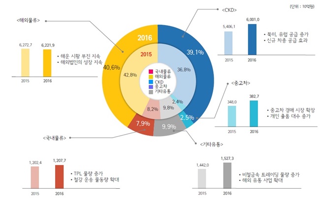 매출에서 가장 높은 비중을 차지하고 있는 해외물류사업은 해운시황 부진 지속으로 소폭 감소한 6조2219억원을 기록했다. 현대·기아 완성차의 국내발 수출 후퇴와 중국발 아프리카 및 중남미 등 신흥국가의 물량 감소가 실적 개선에 제동을 걸었다. 현대·기아차의 수출 물량은 전년 대비 3.5% 감소했다. 다만 원화 약세로 인한 외화 매출 규모와 해외법인 비계열 실적은 개선된 것으로 나타났다.
