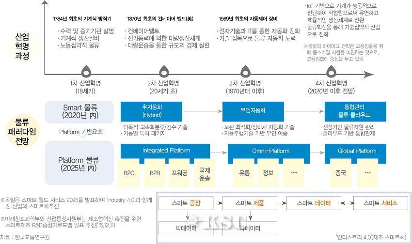 쿠팡, 롯데, 신세계 등 온라인 쇼핑 급증에 대응하는 유통업계의 자동화된 첨단물류센터를 보고나면 생각이 바뀔 것이다. 물론 아직도 시험대에 있는 것은 사실이나 우리가 상상하는 것보다 훨씬 더 많은 변화와 기술적 진보가 진행되고 있다. 입출고 과정을 제외한 전반적인 과정은 이미 자동화되어 인력이 마트에서 하던 역할이 기계적으로 대체되는 것을 쉽게 볼 수 있다. 몇 해 전부터 공유경제가 이슈로 떠오르면서 자동차를 개인의 소유가 아닌 공유물로 취급하는 인식이 짙어지고 있고, 이와 유사한 다양한 서비스가 광범위하게 진행되고 있다. 이처럼 물류를 수행할 수 있는 다양한 대안들로 인해 서비스의 폭이 넓어지고 있다. 그렇다고 기존의 산업과 기술을 무시할 수도 없다. 오히려 기존에 존재했던 범용기술에 대한 중소기업 육성차원의 연구개발(R&D) 투자도 동반되어야 한다. 즉 기존의 기술과 새롭게 변화되는 기술의 공존이 필요한 시점이다. 정부가 이러한 역할을 주도해야 한다.