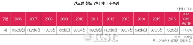 철도 컨테이너 수송량 감소세가 두드러지고 있다. 지난해 철도 컨테이너 수송량은 77만5천TEU(잠정치)를 기록, 4년 연속 하락세를 보였다. 지난해 88만5000TEU, 역대 최고치인 2008년 118만5000TEU에 견줘 각각 34.5% 14.6% 급감했다. 파업 투쟁이 74일간 진행된 탓에 종전 파업 당시(2009년)에 기록한 79만9000TEU와 비슷한 수치다. 철도노조의 운송 거부가 날을 거듭하자 기업들이 육로로 눈을 돌리면서 철도 수송량은 감소했다.