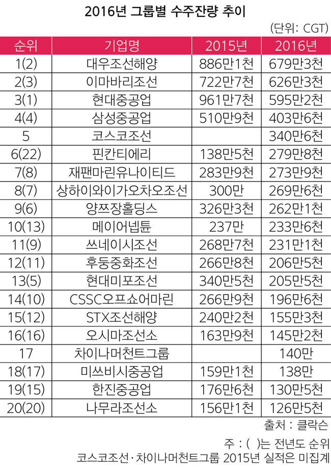 지난해 전 세계 조선소에서 나타난 공통점은 일감 감소가 일제히 진행됐다는 점이다. 한두 조선사를 제외한 대부분 기업들은 빠르게 비어가는 선거(독·Dock)를 지켜볼 수밖에 없었다. 조선소 통합을 결정하며 수주잔량 부문에서 세계 5위에 올라선 코스코조선과 크루즈선 건조 물량을 쓸어 담은 이탈리아 핀칸티에리 등을 제외한 모든 곳에서 일감 공백이 현실화됐다.