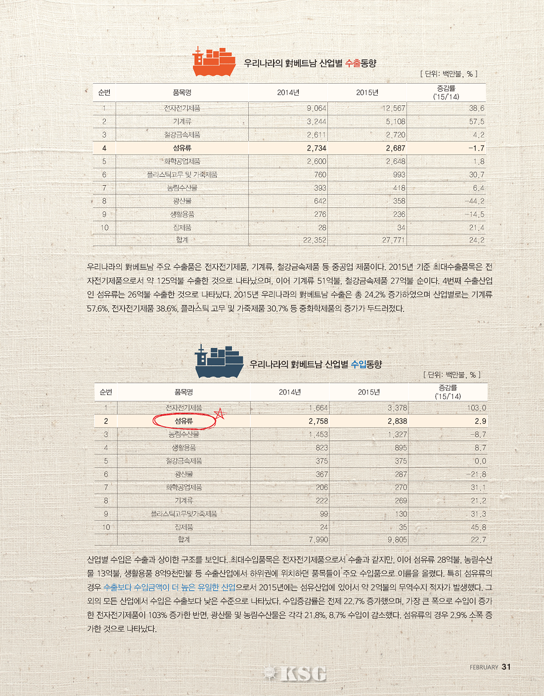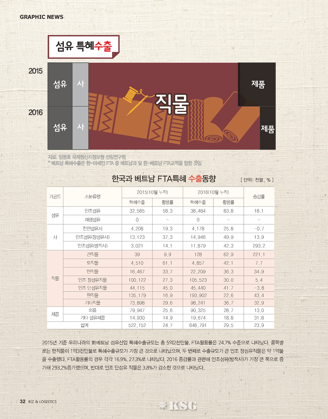 2015년 기준 우리나라의 對베트남 섬유산업 특혜수출규모는 총 5억2천만불, FTA활용률은 24.7% 수준으로 나타났다. 품목별로는 편직물이 1억3천만불로 특혜수출규모가 가장 큰 것으로 나타났으며, 두 번째로 수출규모가 큰 인조 장섬유직물은 약 1억불을 수출했다. FTA활용률의 경우 각각 16.9%, 27.3%로 나타났다. 2016 증감률과 관련해 인조섬유(방적사)가 가장 큰 폭으로 증가해 293.2%증가했으며, 반대로 인조 단섬유 직물은 3.8%가 감소한 것으로 나타났다.