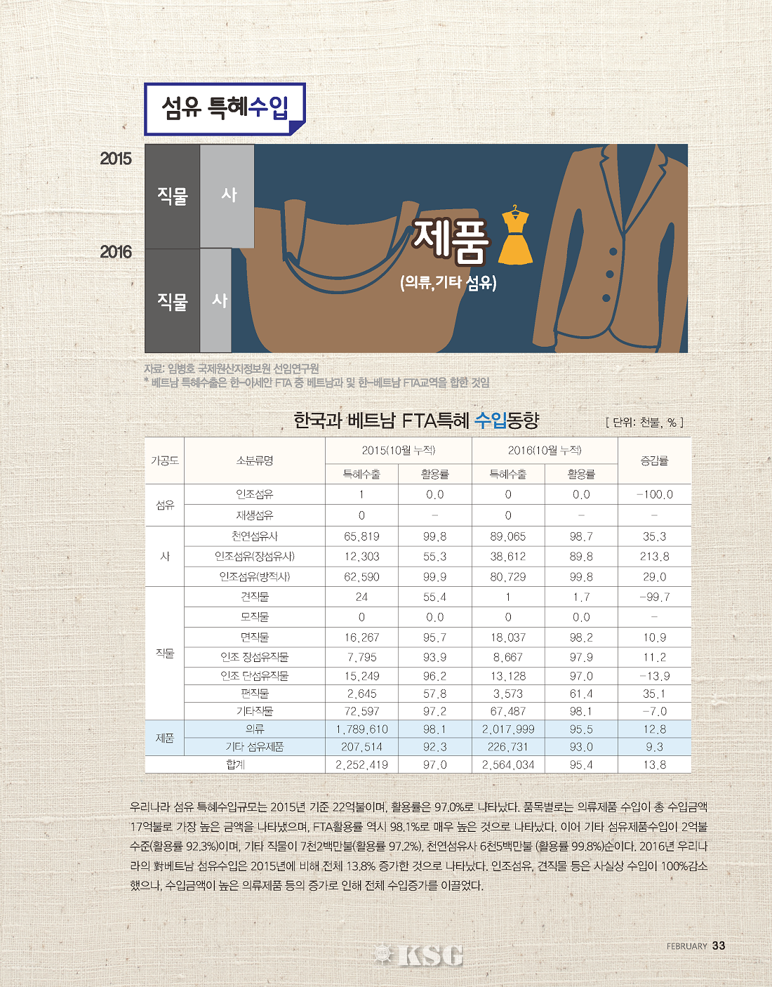 우리나라 섬유 특혜수입규모는 2015년 기준 22억불이며, 활용률은 97.0%로 나타났다. 품목별로는 의류제품 수입이 총 수입금액 17억불로 가장 높은 금액을 나타냈으며, FTA활용률 역시 98.1%로 매우 높은 것으로 나타났다. 이어 기타 섬유제품수입이 2억불 수준(활용률 92.3%)이며, 기타 직물이 7천2백만불(활용률 97.2%), 천연섬유사 6천5백만불 (활용률 99.8%)순이다. 2016년 우리나라의 對베트남 섬유수입은 2015년에 비해 전체 13.8% 증가한 것으로 나타났다. 인조섬유, 견직물 등은 사실상 수입이 100%감소했으나, 수입금액이 높은 의류제품 등의 증가로 인해 전체 수입증가를 이끌었다.