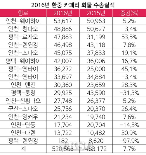 부동의 1위는 한중 카페리항로의 맏형인 위동항운이다. 이 선사가 운영 중인 인천-웨이하이와 인천-칭다오는 5만3616TEU 4만8886TEU를 기록, 각각 1~2위에 올랐다. 일조국제훼리의 평택-르자오가 4만7833TEU로 3위에 올랐다. 2015년까지 8위에 머물렀던 이 노선은 평택을 거점으로 하는 경쟁노선들의 잇따른 운항중단을 배경으로 괄목할 만한 성과를 만들어냈다.