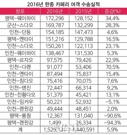 노선별로 보면 13곳이 상승곡선을 그렸다. 최고 실적은 17만2296명을 수송한 평택-웨이하이 노선에 돌아갔다. 이 항로를 운항 중인 평택교동훼리는 2015년의 12만8152명에 비해 34.4% 늘어나는 고성장을 거두며 6위에서 1위로 수직상승했다. 호성적을 배경으로 창사 이래 처음으로 성과급이 지급됐다는 후문이다.