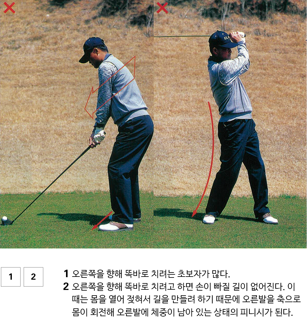 그러나 처음부터 오른쪽을 향하고 있기 때문에 똑바로 치려고 하면 할수록 임팩트에서 막힌다. 임팩트에서 막힌다는 것은 손이 빠지는 장소가 없다는 것을 의미한다. 그래서 몸을 열어 손이 빠지는 길을 만들려고 하다 보니 오른발을 회전축으로 몸을 회전해 체중이 오른쪽에 남아 있는 상태가 된다.
