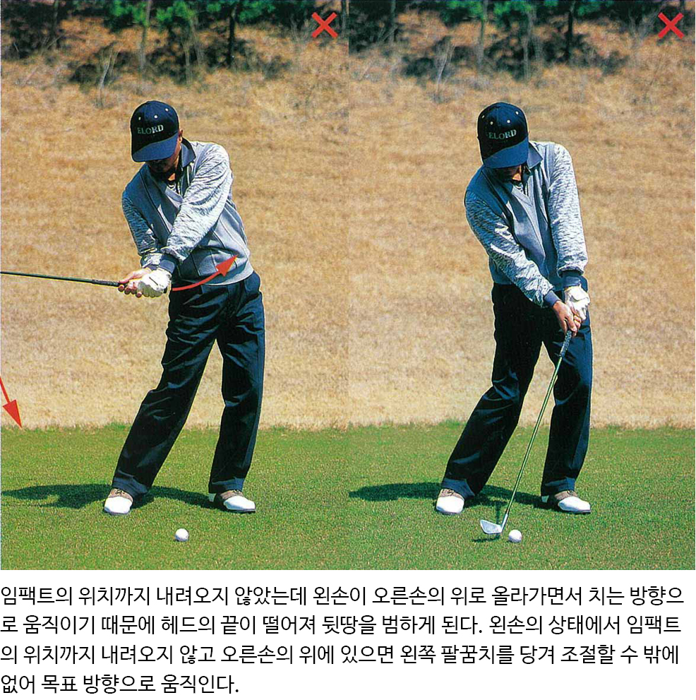 클럽 헤드가 스윙 궤도의 최하점을 지날 때까지 스윙을 주도하는 왼손의 손등은 목표 방향을 향해야 하는데 다운스윙이 진행되는 동안 왼손이 허리 높이에서 오른손의 위로 올라가기 때문에 뒷땅이 일어난다.