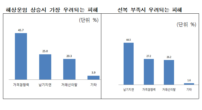 또 선복 부족에 따른 운송 차질 문제를 겪고 있다고 한 업체가 절반이 넘는 58%에 이르렀고 이들은 ‘납기 지연’(44.5%) ‘거래선 이탈’(26.2%) 등을 우려하고 있는 것으로 나타났다.