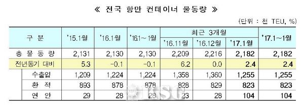 1월 전국 ‘컨’물동량, 전년比 2.4%↑