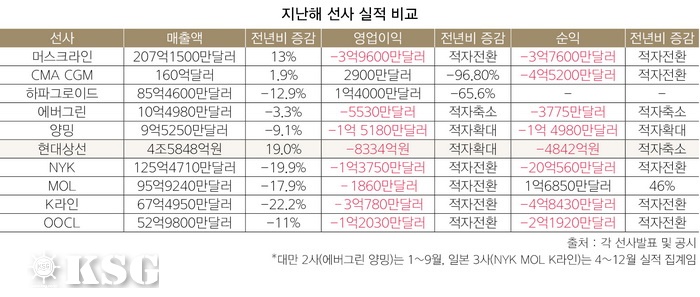 영업이익은 전년 9억1100만달러에서 96.8% 감소했지만 정기선시장의 급격한 운임하락과 과잉공급 환경에서 시장 평균을 상회하며 흑자를 일궜다. 매출액은 전년 157억달러에서 1.9% 증가했다. 순익은 -4억5200만달러(약 5060억원)로 전년 5억6700만달러에서 적자전환했다.
