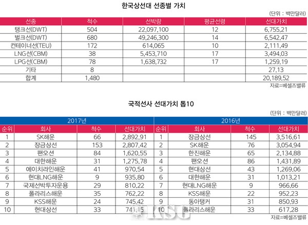 눈에 띄는 건 지난해 순위권 밖이었던 에이치라인해운이 41척 9억7100만달러의 선대로 5위에 올랐다는 점이다. 에이치라인해운은 지난해 현대상선 벌크전용선 부문을 인수하면서 선박 12척을 새롭게 확보했다. 또 선박운용사인 국제선박투자운용이 보유선대 29척 81000만달러로, 7위에 랭크되며 순위권에 새롭게 진입했다. 현대LNG해운은 선대가치는 다소 줄어들었지만 순위는 한 계단 상승한 6위를 기록했다.