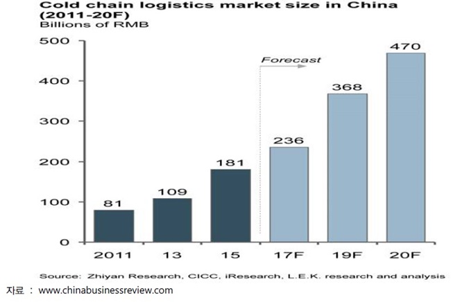 중국 콜드체인물류시장은 2011년 약 13조원에서 2015년 약 29조원으로 지난 5년 동안 연평균 22.3% 성장했다. 향후 2020년에는 신선식품과 의약품에 대한 수요 증가로 약 77조원 규모의 시장으로 올라설 전망이다. 수송이 40%, 냉장보관이 30%, 기타서비스가 30%를 차지할 것으로 예상된다.