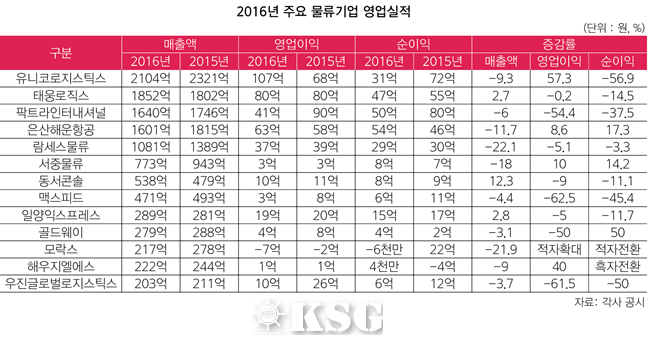 서중물류와 우진글로벌로지스틱스는 지난해 매출액 부문에서 마이너스 성장을 나타냈다. 서중물류의 주 매출인 운송수익은 2015년 943억원에서 2016년 773억원으로 18% 후퇴했다. 영업이익과 순이익은 전년 대비 10% 14.2% 각각 증가한 3억원 8억원을 기록했다.