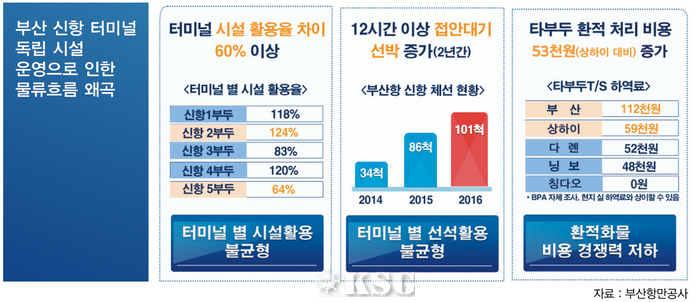 현재 부산 신항에는 5개 터미널이 운영되고 있다. 별 탈없이 성장을 거듭하던 터미널 운영은 얼라이언스 규모가 거대해지면서 새로운 문제에 맞닥뜨렸다. 얼라이언스는 줄어든 반면, 다수의 터미널은 그대로 분리 운영되면서 항만비효율이 표면화되고 있다. 부산 신항에 12시간 이상 접안 대기한 선박은 2014년 34척에서 지난해 101척으로 대폭 증가했다. 터미널별로 시설 활용률이 60%이상 차이가 나는 곳도 있다. 여기에 타부두환적 처리비용은 동북아 최대 환적항인 부산항의 자리를 중국항만들에 내어줄 여지를 높이고 있다. 부산 신항의 타부두 환적 하역료는 11만2천원으로, 경쟁 항만인 상하이항 5만9천원의 2배나 달한다. 반면 부산항의 수출입 하역료는 20피트 컨테이너(TEU)당 평균 5~6만원선으로 경쟁항만의 반 토막 수준에 머물러있다. 터미널 운영사들이 낮은 수출입하역료로 수익성 악화에 고통 받자 타부두환적 하역료를 높게 받으므로써 환적물량에 의존하고 있는 부산항의 비용경쟁력을 저하시키고 있는 실정이다.