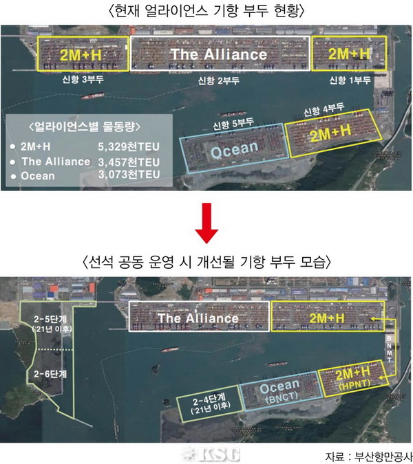 3개의 얼라이언스들은 부산 신항의 5개 터미널에 분산 기항하고 있다. 한 터미널에 기항이 어려운 데다 터미널 운영사들과의 개별 협상결과 뿔뿔이 흩어지는 처지가 됐다. 2M+H는 신항 1, 3, 4부두, 디얼라이언스는 신항 2부두, 오션얼라이언스는 5부두에 둥지를 틀었다. 가장 많은 물동량을 처리하는 2M+H(532만9천TEU)가 3개 부두로 나뉘어 기항을 하게 되면서 덩달아 타부두간의 불필요한 화물 이동도 발생하고 있다. 부산항만공사에 따르면 지난해 신항의 터미널간 화물이동은 70만TEU로 그 비용이 87억원에 달한다.